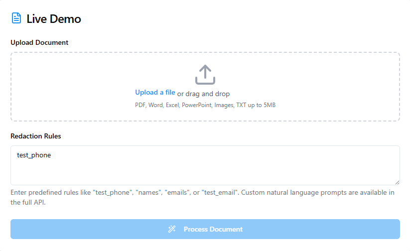 Automatically remove sensitive information from any document using natural language prompts. Built for developers, trusted by enterprises.