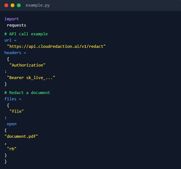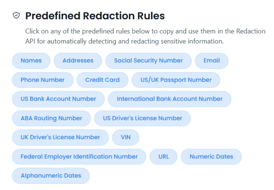 Integrate document redaction into your application with just a few lines of code. No complex rules or templates required. You can also set default redactions in your account using our Predefined Redaction Rules for even faster turnaround.